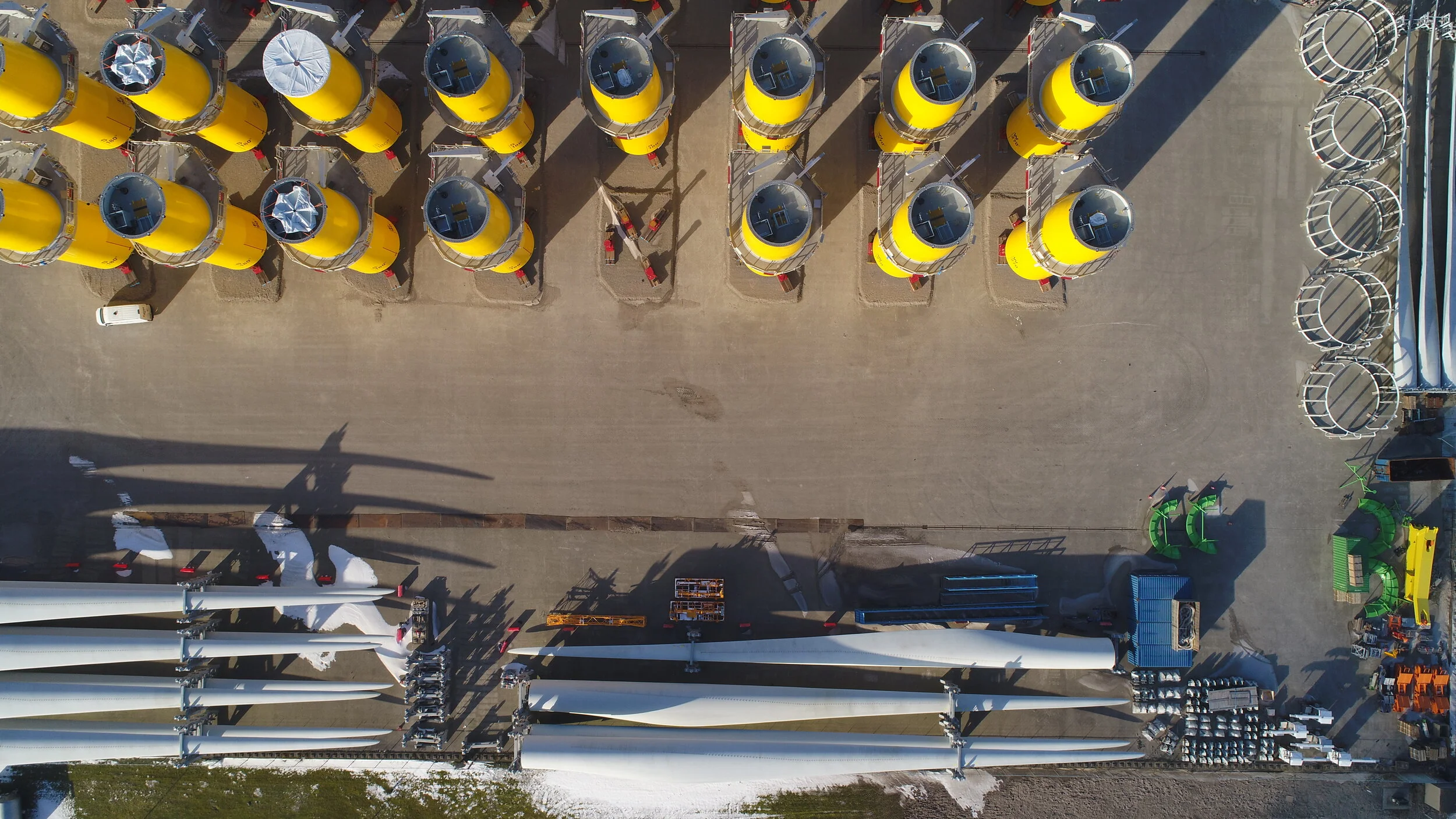 Drone Inspectie van het opslagterrein voor windturbines